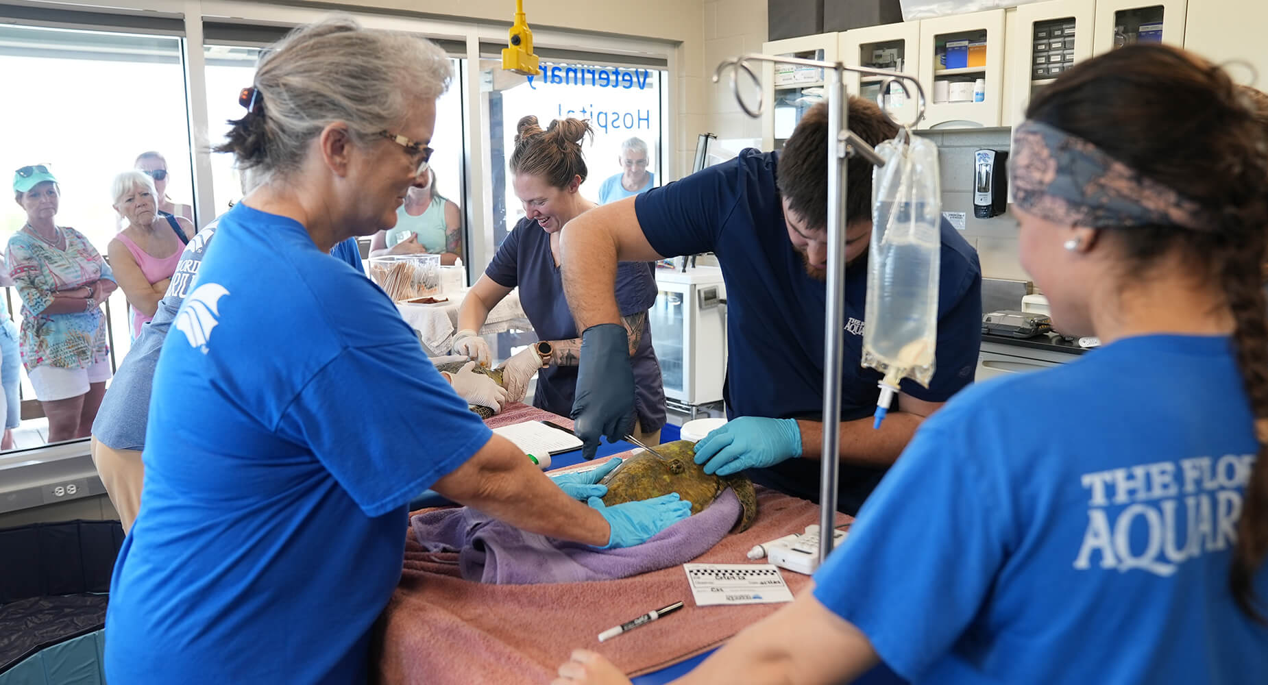 All sea turtle rehabilitation work conducted by The Florida Aquarium is done with the approval of the Florida Fish and Wildlife Commission under conditions not harmful to marine turtles and authorized under conservation activities pursuant to FWC MTP-25-179.