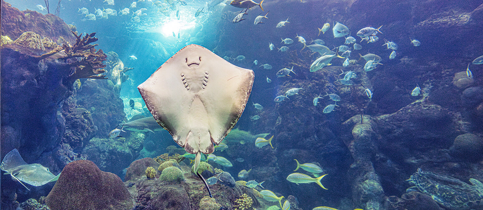 Gaze up at giant southern stingrays, sand tiger sharks, sea turtles, and more in our largest habitat, the Coral Reefs.