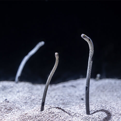 What lies below? Meet the creatures that reside under rock pilings and bridges in the salty waters along coastal regions. Spiny lobsters peer out from rocky refuges, garden eels poke their heads out of sandy burrows, and curious pufferfish flit beneath the surface — all amidst the rhythmic sounds of rolling waves in this mysterious and exciting habitat.