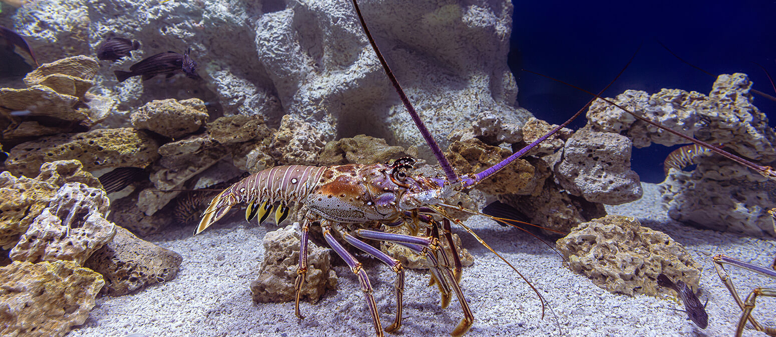 Characterized by a reddish-brown shell, Florida spiny lobsters can let each other know they’re around with sounds produced by rubbing their long antennae together. They are nocturnal feeders and hide in crevices during the day. As they grow, they molt or shed their hard exoskeleton, during which they are more vulnerable to predators.