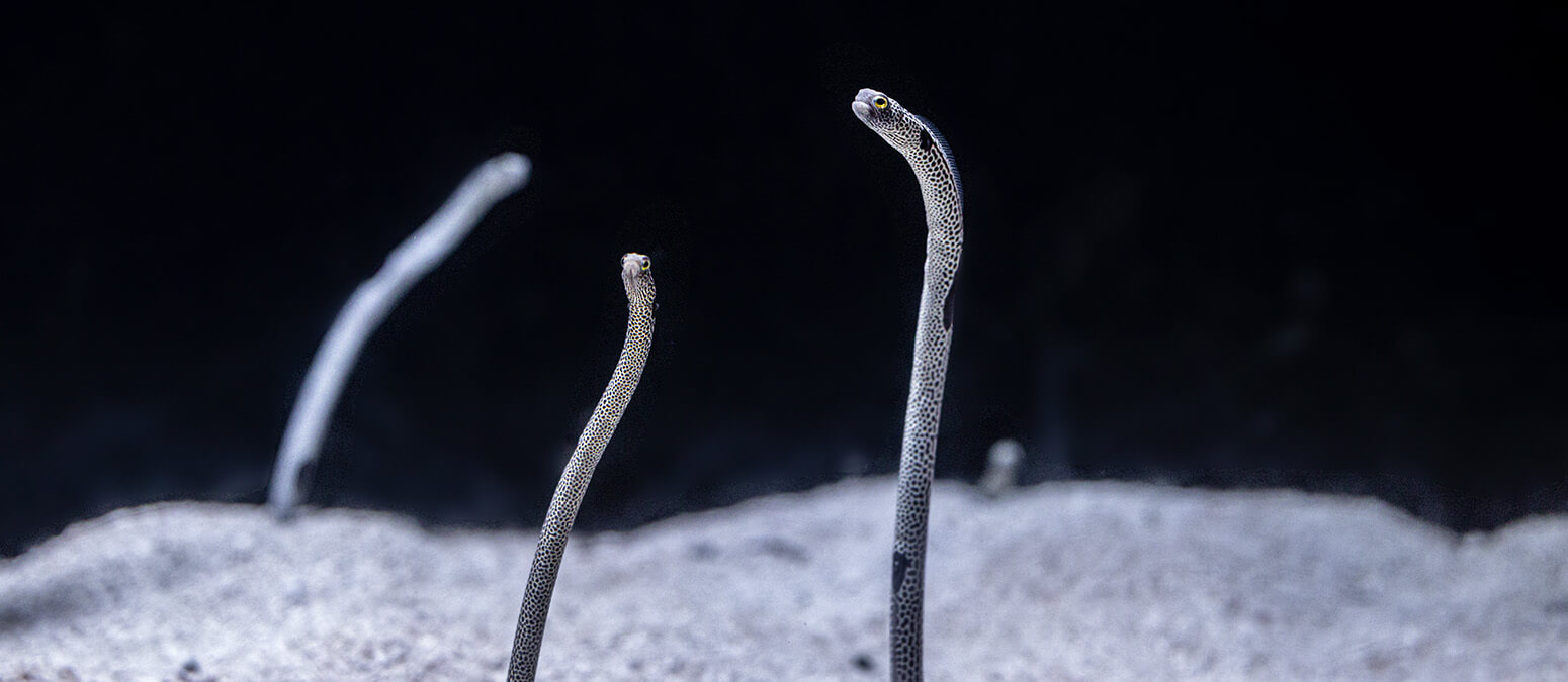 Using their pointed tails to dig holes in the sand and body mucus to clump the sand together into a solid burrow, these slender eels spend most of their lives with more than half of their bodies buried in the sand. They extend their bodies and face into the current to find zooplankton to eat, hardly ever leaving their burrows — even to mate. Instead, males and females will move their burrows closer and stretch from adjacent burrows to spawn. Juveniles start out completely black and turn white with black spots as they mature.