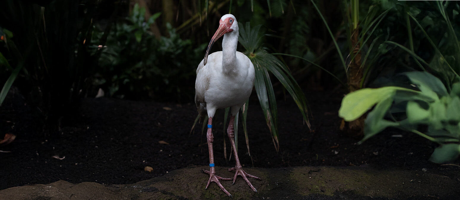 White birds with long curved red beaks, American white ibis can fly over 15 miles a day in search of food. With nostrils at the base of their sensitive bills, they can breathe and detect prey even while submerging their bills in water or mud. They wade in the water, moving their long bills back and forth and probing the bottom to find prey.