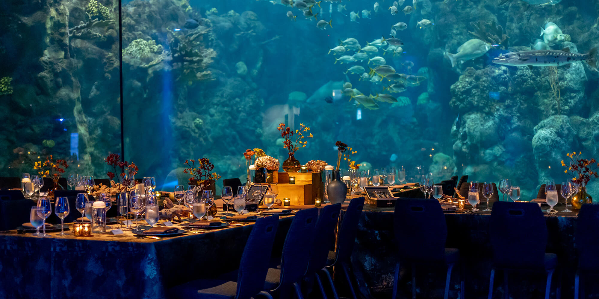 Whether a seated dinner for 80 or a cocktail reception for 200 guests, you’ll enjoy watching the fish and sharks in our 500,000-gallon floor-to-ceiling panoramic window in the Coral Reefs gallery.