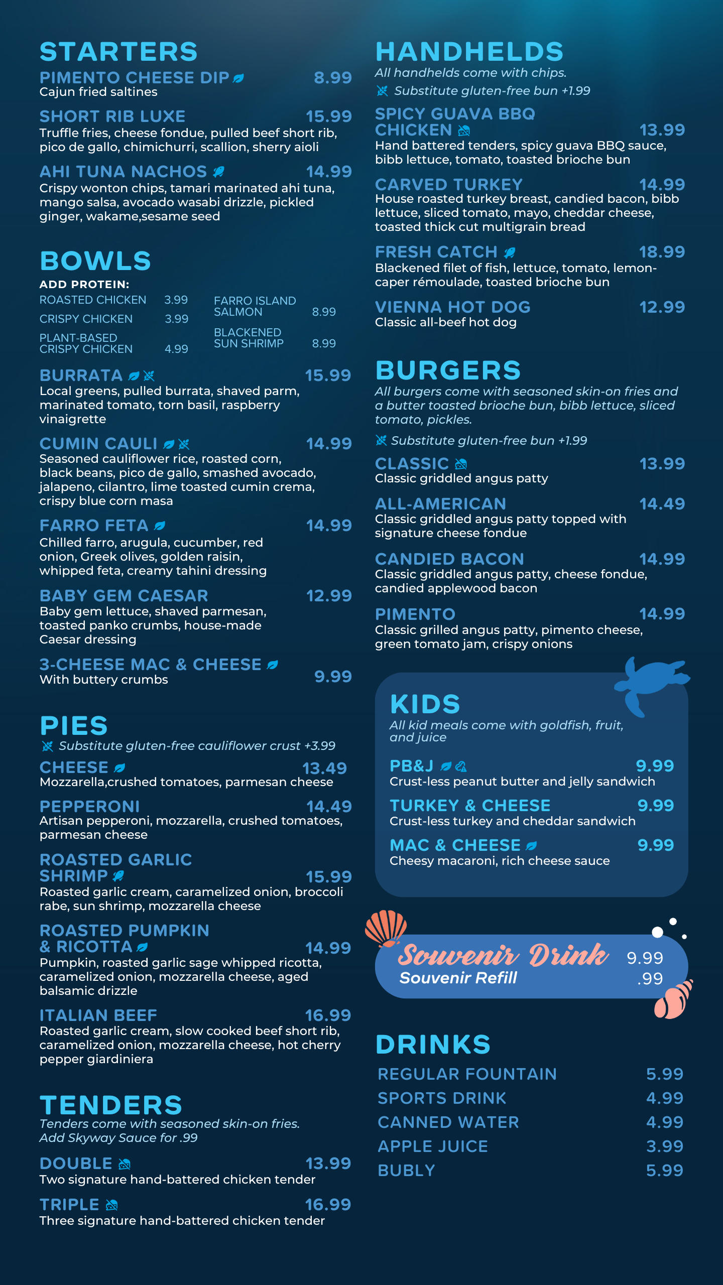 Indulge in family favorites like burgers, pizzas, sandwiches, and hand-battered chicken tenders. Kids’ meal options and daily specials are also available.